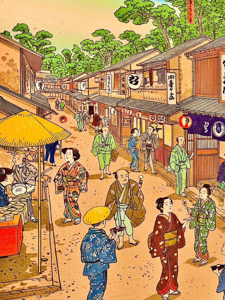 日本の江戸時代の人々の生活はどんな感じだったのでしょう。もちろん生きていくのに大変な面も多かったと思いますが、現代のようにファッションや旅行を楽しむ姿も見られたようです。歌舞伎が生まれたのもこの時代で、ここから様々な「芸能」が発展していきました。そんな昔の人々の情緒ある生活の雰囲気をデザインに込めてみました。
